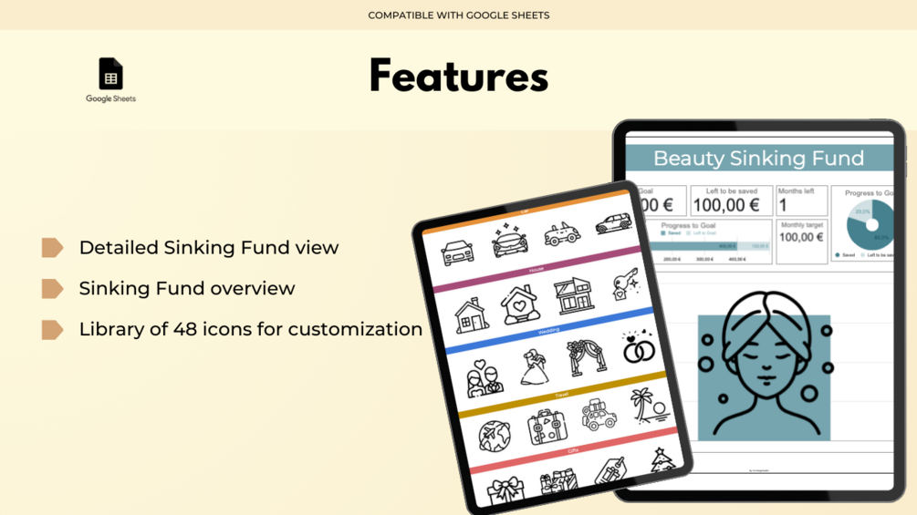 All with its intuitive design and customizable features, where you can easily and visually track your sinking funds, plan for upcoming expenses, and make informed financial decisions. Includes a library of 48 icons for personalisation!