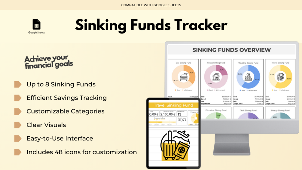 Achieve your financial goals with our Sinking Funds Tracker. Prioritize savings, plan for the future, and track your expenses. Includes 48 icons. Start now!